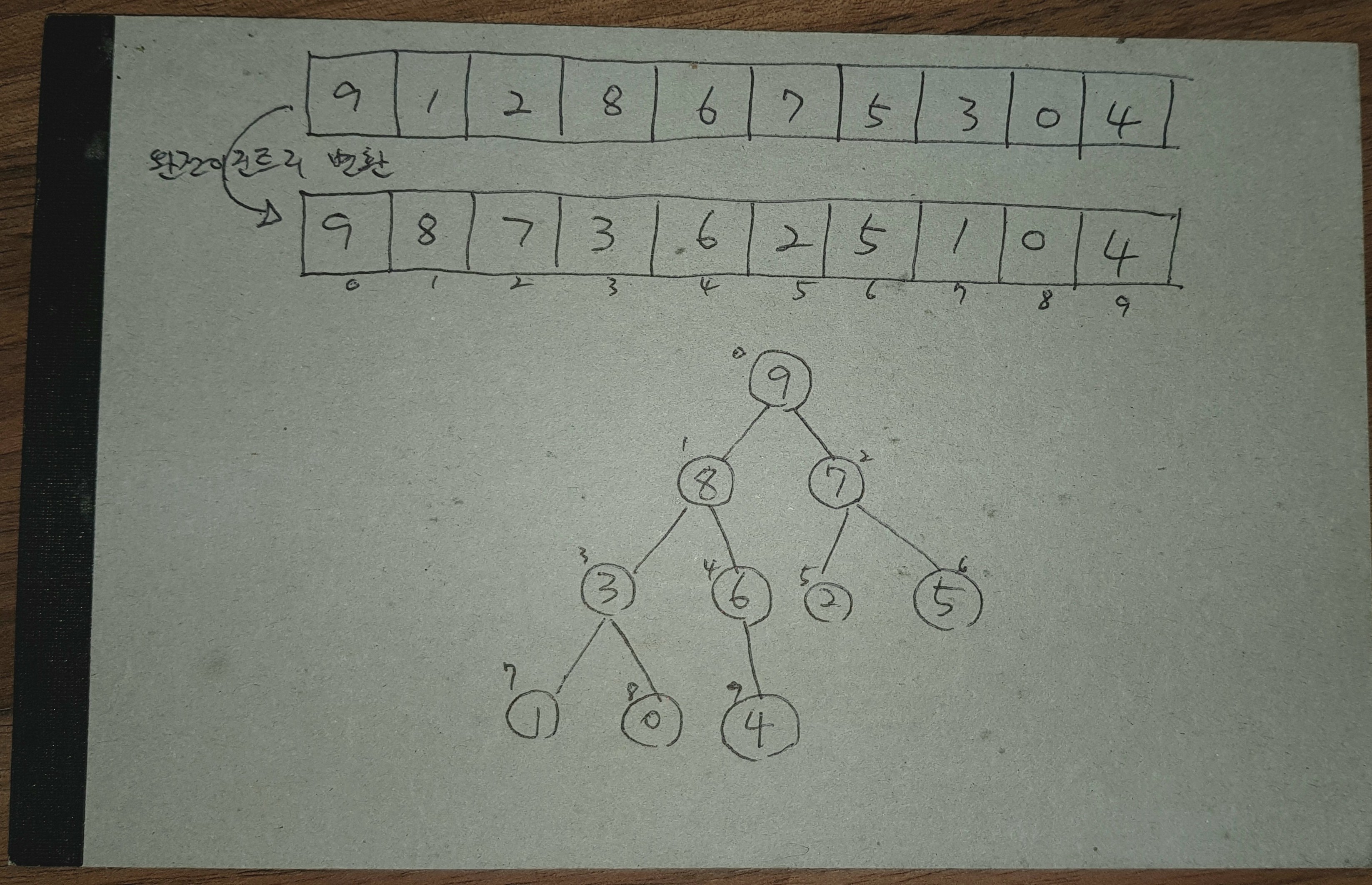 배열을 완전이진트리로 변환되는 과정을 그리면 이해하기 편합니다.