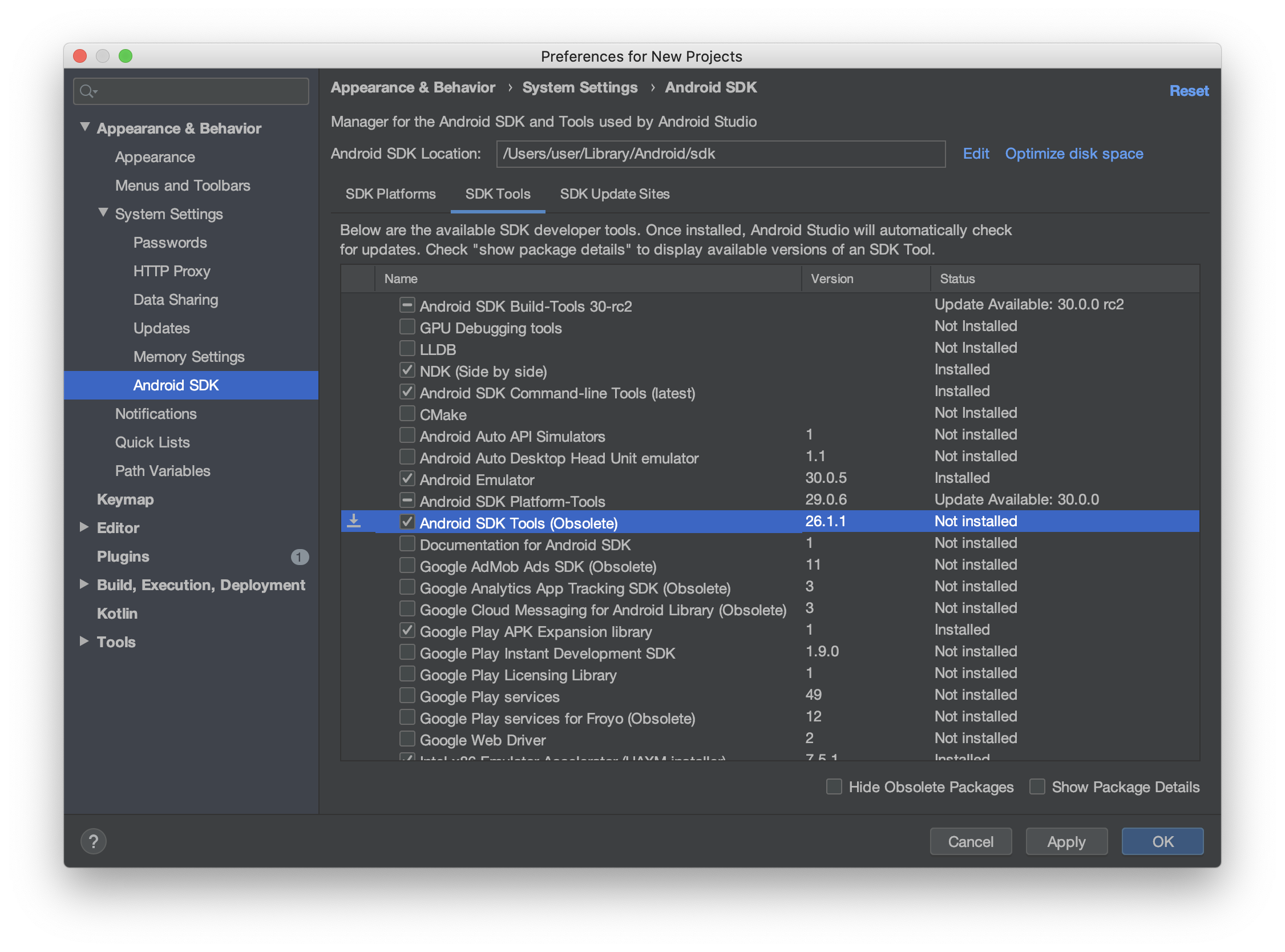 그래서 Android Studio의 SDK manager에서 SDK Tools 탭을 선택하고 아래 Hide Obsolete Packages 체크 해제하면 Android SDk Tools 가 보이게 됩니다.